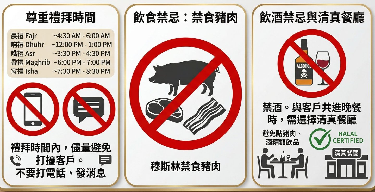 印尼是世界上穆斯林人口最多的國家,伊斯蘭教深刻影響著印尼人的生活方式、節慶、商業行為。穆斯林每天需進行5次禮拜,禮拜時間內,儘量避免打擾;禁食豬肉、禁酒。