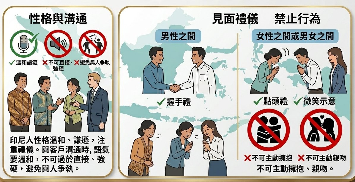 印尼人性格溫和、謙遜,不喜歡公開衝突,認為直接拒絕是失禮的行為,不要當面直言「NO」。